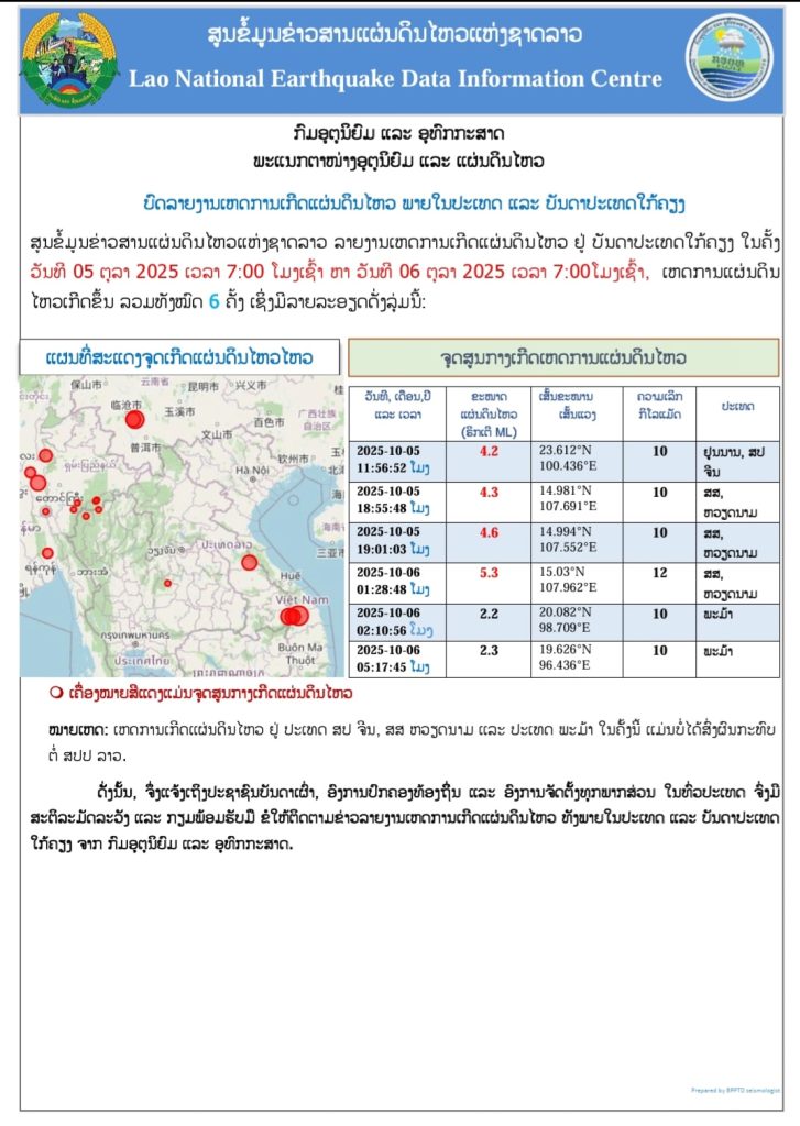 ລາຍງານເຫດການເກີດແຜ່ນດິນໄຫວຢູ່ບັນດາປະເທດໃກ້ຄຽງ ໃນຄັ້ງວັນທີ 05 ຕຸລາ 2025 ເວລາ 07:00 ໂມງເຊົ້າ ຫາ ວັນທີ 06 ຕຸລາ 2025 ເວລາ 07:00 ໂມງເຊົ້າ, ເຫດການແຜ່ນດິນໄຫວເກີດຂື້ນ ລວມທັງໝົດ 6 ຄັ້ງເຊິ່ງທີລາຍລະອຽດດັ່ງລຸ່ມນີ້: