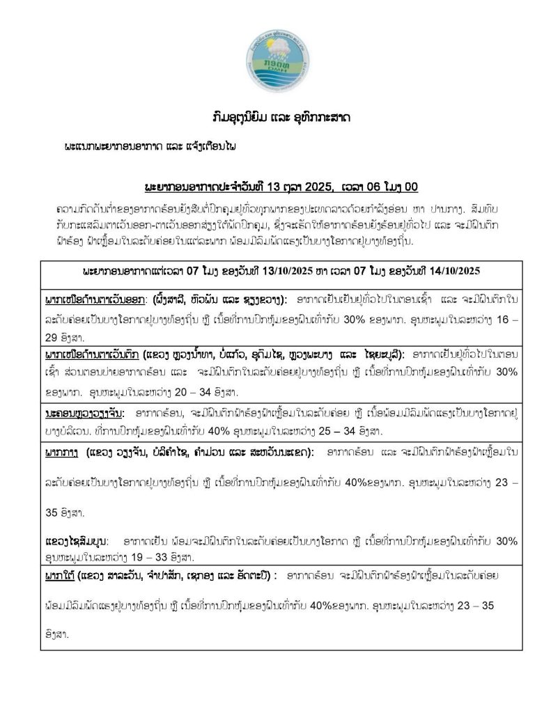 ພະຍາກອນອາກາດປະຈໍາວັນທີ 13 ຕຸລາ 2025