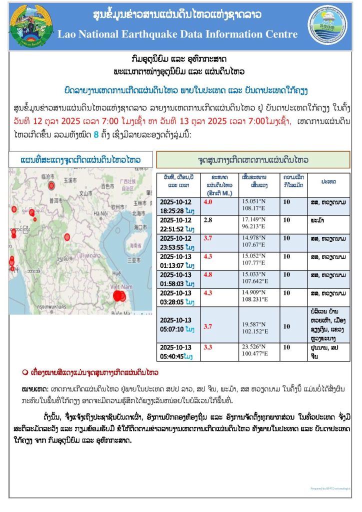 ພາຍໃນປະເທດ ແລະ ບັນດາປະເທດໃກ້ຄຽງ, ສູນຂໍ້ມູນຂ່າວສານແຜ່ນດິນໄຫວແຫ່ງຊາດລາວ ລາຍງານເຫດການເກີດແຜ່ນດິນໄຫວ ຢູ່ ບັນດາປະເທດໃກ້ຄຽງ ໃນຄັ້ງວັນທີ 12 ຕຸລາ 2025 ເວລາ 7:00 ໂມງເຊົ້າ ຫາ ວັນທີ 13 ຕຸລາ 2025 ເວລາ 7:00 ໂມງເຊົ້າ.