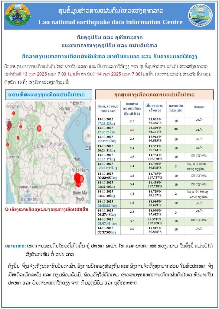 ລາຍງານເຫດການເກີດແຜ່ນດິນໄຫວພາຍໃນປະເທດ ແລະ ບັນດາປະເທດໃກ້ຄຽງປະຈໍາວັນທີ 13 -14 ຕຸລາ 2025