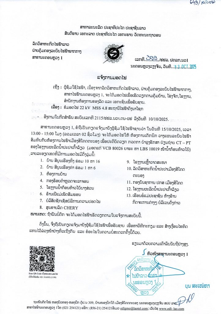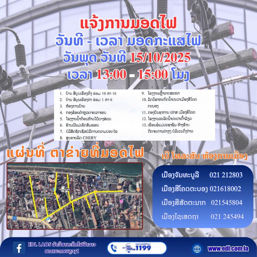 ແຈ້ງການມອດໄຟ ວັນທີ15/10/2025