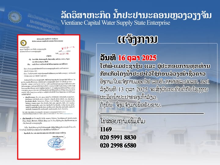ລັດວິສາຫະກິດ ນ້ຳປະປານະຄອນຫຼວງວຽງຈັນ ແຈ້ງການເຖິງບັນດາຜູ້ຊົມໃຊ້ນ້ຳປະປາ ໃຫ້ກະກຽມກັກເກັບນ້ຳໄວ້ຊົມໃຊ້ໃຫ້ພຽງພໍ ຢູ່ຂອບເຂດພື້ນທີ່ ທີ່ຢູ່ໃກ້ຄຽງ ຂອງເມືອງສີໂຄດຕະບອງ ແລະ ເມືອງຈັນທະບູລີ ນະຄອນຫຼວງວຽງຈັນ.