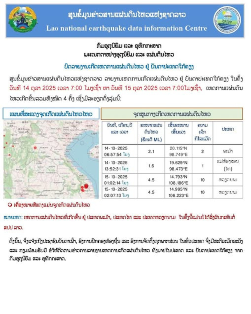 ລາຍງານເຫດການແຜ່ນດິນໄຫວໃນຄັັ້ງວັນທີ 14 ຕຸລາ 2025 ເວລາ 7:00 ໂມງເຊົ້າ ຫາ ວັນທີ 15 ຕຸລາ 2025