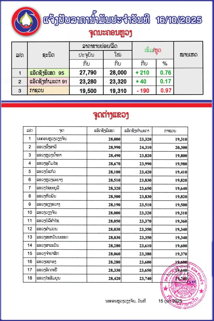 ທີ່ມາ: ລັດວິສາຫະກິດ ນໍ້າມັນເຊຶ້ອໄຟລາວ (ລນລ)