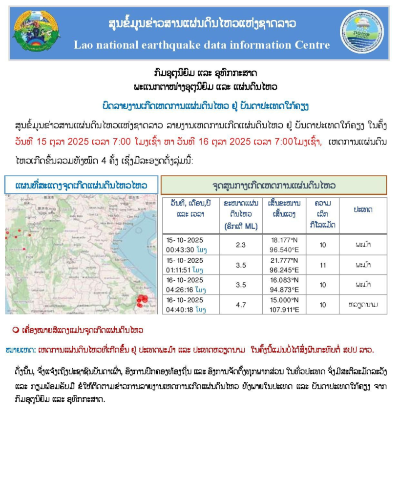 ສູນຂໍ້ມູນຂ່າວສານແຜ່ນດິນໄຫວແຫ່ງຊາດລາວ ລາຍງານເຫດການເກີດແຜ່ນດິນໄຫວ ຢູ່ບັນດາປະເທດໃກ້ຄຽງ ໃນຄັ້ງວັນທີ 15 ຕຸລາ 2025 ເວລາ ຫາ ວັນທີ 16 ຕຸລາ 2025 , ເຫດການແຜ່ນດິນໄຫວເກີດຂຶ້ນລວມທັງໝົດ 4 ຄັັ້ງ ເຊິິ່ງເຫດການແຜ່ນດິນໄຫວທີິ່ເກີດຂຶ້ນຢູ່ປະເທດມຽນມາ ແລະ ປະເທດ ສສ ຫວຽດນາມ ໃນຄັ້ງນີ້ແມ່ນບໍ່ໄດ້ສົ່ງຜົນກະທົບຕໍ່ ສປປ ລາວ. ດັ່ງມີລະອຽດລຸ່ມນີ້: