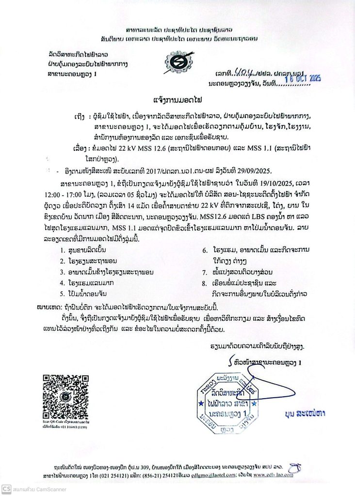 ແຈ້ງການມອດໄຟ ວັນທີ 19/10/2025