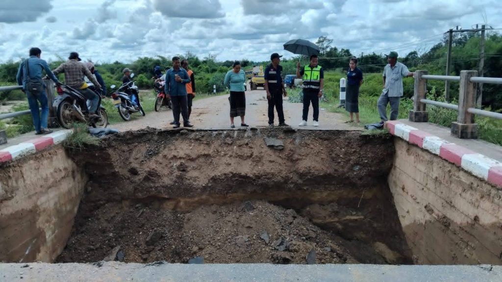 ຂົວດັ່ງກ່າວແມ່ນຖືກຜົນກະທົບຈາກພະຍຸນາກາຊາ, ພະຍຸບົວລອຍ ເຮັດໃຫ້ປະລິມານນ້ຳເພີ່ມຂຶ້ນຫລາຍໃນການໄຫລຜ່ານກ້ອງຂົວ ແລະ ນ້ຳກັດເຊາະບໍລິເວນຖານຫົວຂົວຈຶ່ງເຮັດໃຫ້ດິນເຊາະເຈື່ອນລົງ ເປັນບໍລິເວນກວ້າງ ເຮັດໃຫ້ຫົວຂົວດັ່ງກ່າວຍຸບລົງ ໃນຂະໜາດ ຄວາມກວ້າງຂອງດິນຍຸບ 6 ແມັດ, ເລິກ 6 ແມັດ.