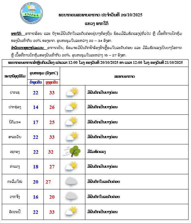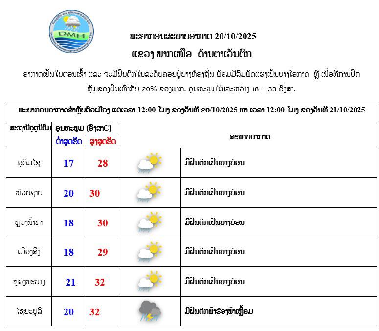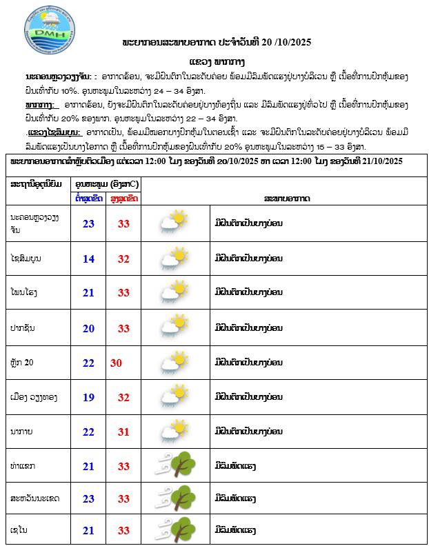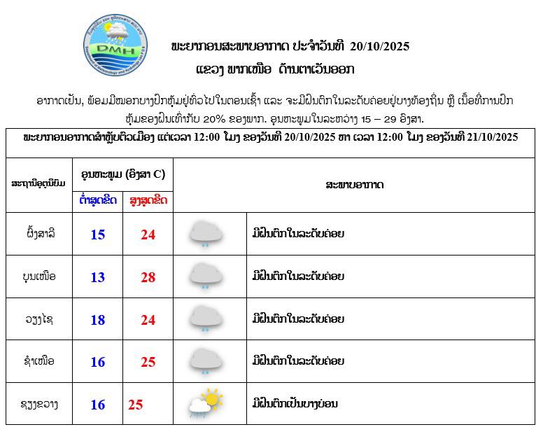 ພະຍາກອນອາກາດ ປະຈຳວັັນທີ 20 ຕຸລາ 2025
