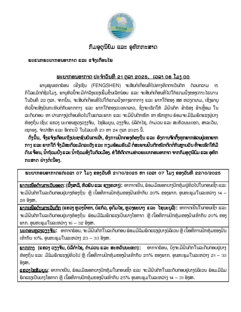 ພະຍາກອນອາກາດ ແຕ່ເວລາ 07 ໂມງ ຂອງວັນທີ 21/10/2025