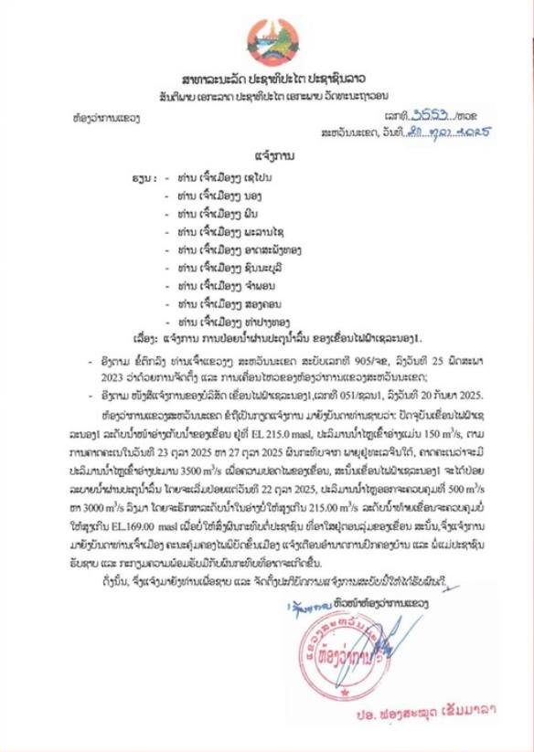 ຕາມແຈ້ງການ ຄັ້ງວັນທີ 21/10/2025 ທາງເຂື່ອນໄຟຟ້ານໍ້າຕົກ ທີ່ເມືອງອາເລື້ອຍ ສສ ຫວຽດນາມ ເຊິ່ງເປັນເຂື່ອນ ທີ່ຕັ້ງຢູ່ເຊກອງຕອນເທິງຂອງແຂວງເຊກອງ ແລະ ແຂວງອັດຕະປື ຈະໄດ້ມີການປ່ອຍນໍ້າອອກຈາກອ່າງເກັບນໍ້າ ທີ່ ຈະໄຫຼລົງສູ່ເຊກອງຕອນລຸ່ມ ກໍ່ຄື ແຂວງເຊກອງ ແລະ ແຂວງອັດອັດຕະປື ເຊິ່ງມີການຄວບຄຸມໃຫ້ຢູ່ໃນລະດັບ ຄ່ອຍ ແລະ ອາດເພີ່ມຂຶ້ນເຖິງ 1.800 ແມັດກ້ອນ/ວິນາທີ ເຊິ່ງຄາດວ່າຈະເລີ່ມປ່ອຍ ແຕ່ເວລາ 12:00 ໂມງ ຂອງ ວັນທີ 22/10/2025.