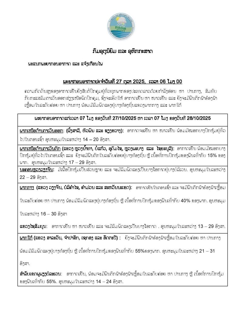 ສະພາບອາກາດປະຈໍາເຊົ້າວັນທີ 27 ຕຸລາ 2025 ມີຄວາມກົດດັນສູງຂອງອາກາດເຢັນຍັງສືບຕໍ່ປົກຄຸມຢູູ່ທົົ່ວທຸກພາກຂອງປະເທດລາວ ດ້ວຍກໍາລັງອ່ອນ ຫາ ປານກາງ, ສົມທົບກັບກະແສລົມຕາເວັນອອກສ່ຽງເໜືອພັດປົກຄຸມ, ເຊິ່ງຈະເຮັດໃຫ້ອາກາດເຢັນ ຫາ ໜາວເຢັນ ແລະ ຍັງຈະມີຝົນຕົກ ຟ້າຮ້ອງ ຟ້າເຫລື້ອມໃນລະດັບຄ່ອຍ ຫາ ປານກາງ ພ້ອມມີລົມພັດແຮງຢູູ່ບາງທ້ອງຖິ່ນແຂວງພາກກາງ ແລະ ພາກໃຕ້.