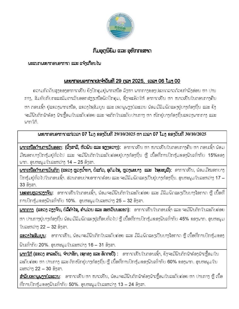 ລາຍງານສະພາບອາກາດປະຈໍາວັນທີ 29 ຕຸລາ 2025