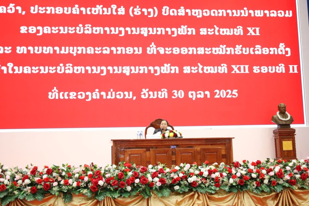ກອງປະຊຸມ ຄົ້ນຄວ້າ, ປະກອບຄໍາເຫັນໃສ່ຮ່າງບົດສໍາຫຼວດການນໍາພາລວມຂອງຄະນະບໍລິຫານງານສູນກາງພັກ ສະໄໝທີ XI ແລະ ທາບທາມບຸກຄະລາກອນ ທີ່ຈະອອກສະໝັກຮັບເລືອກຕັ້ງເຂົ້າໃນ ຄະນະບໍລິຫານງານສູນກາງພັກ ສະໄໝທີ XII ຮອບທີ II ຢູ່ຈຸດແຂວງຄໍາມ່ວນ ຈັດໃນຂຶ້ນວັນທີ 30 ຕຸລາ 2025 ຢູ່ທີ່ສະໂມສອນຂອງແຂວງ, ໂດຍພາຍໃຕ້ການເປັນປະທານຂອງ ສະຫາຍ ນາງ ສີໃສ ລືເດດມູນສອນກໍາມະການກົມການເມືອງສູນກາງພັກຫົວໜ້າຄະນະຈັດຕັ້ງສູນກາງພັກ, ມີບັນດາສະຫາຍໃນຄະນະບໍລິຫານງານພັກ ແຂວງຄໍາມ່ວນ, ບໍລິຄໍາໄຊ ແລະ ສະຫວັນນະເຂດ ເຂົ້າຮ່ວມ.