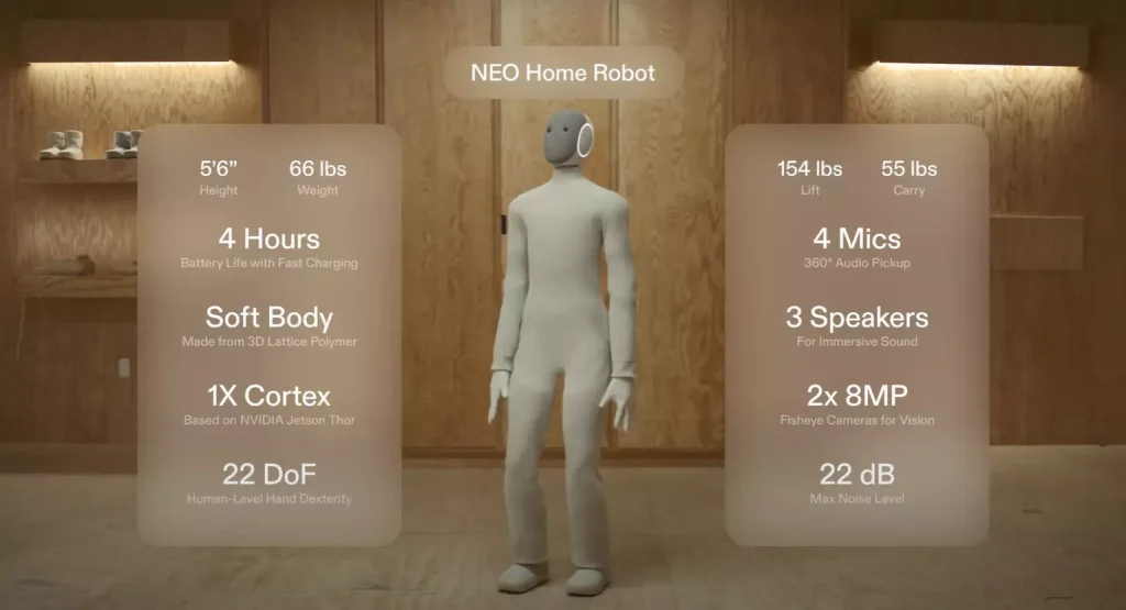 ມັນສວມຮອງເທ້າຜ້າໃບສຸດເທ່ ສ່ວນຫົວມີໄຟ LED ຮູບຊົງກົມຄູ່ໜຶ່ງທີ່ຊ່ວຍສື່ຄວາມຕັ້ງໃຈຂອງຫຸ່ນຍົນ ແຕ່ມັນກໍ່ສາມາດສື່ສານຜ່ານການເວົ້າຄຸຍໄດ້ຕາມຂໍ້ມູນຈາກ 1X. Neo Home Robot ມີໄມໂຄຣໂຟນ 4 ຕົວ ແລະລຳໂພງ 3 ຕົວ ຂັບເຄື່ອນດ້ວຍ AI ທີ່ພັດທະນາເອງຊື່ Redwood AI ໃຊ້ຊິບປະມວນຜົນຈາກ Nvidia.