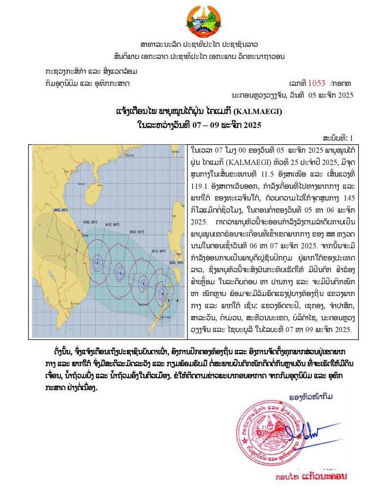 ແຈ້ງເຕືອນໄພ ພາຍຸໝູນໄຕ້ຝຸ່ນໄຄແມກິ(KALMAEGI) ໃນລະຫວ່າງ ວັັນທີ 07–09 ພະຈິກ 2025 (ສະບັບທີ 1)
