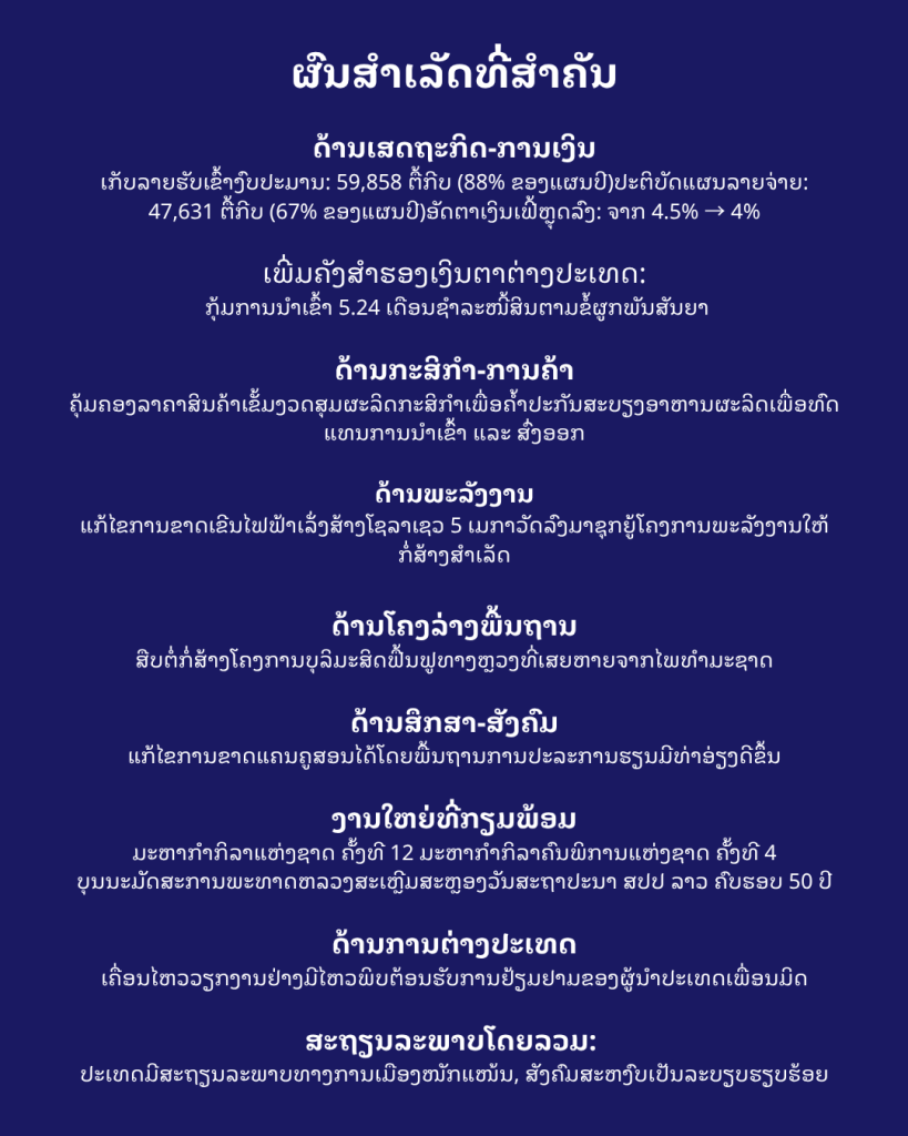 ທົ່ວປະເທດສືບຕໍ່ຮັກສາໄດ້ສະຖຽນລະພາບທາງດ້ານການເມືອງຢ່າງໜັກແໜ້ນ, ສັງຄົມມີຄວາມສະຫງົບ ແລະ ເປັນລະບຽບຮຽບຮ້ອຍໂດຍພື້ນຖານ.ສາມາດຈັດເກັບລາຍຮັບເຂົ້າງົບປະມານໄດ້ 59.858 ຕື້ກີບ ເທົ່າກັບ 88% ຂອງແຜນປີ, ການປະຕິບັດແຜນລາຍຈ່າຍໄດ້ 47.631 ຕື້ກີບ ເທົ່າກັບ 67% ຂອງແຜນປີ; ການຄວບຄຸມອັດເງິນເຟີ້ ຫລຸດລົງຈາກ 4,5% ໃນເດືອນກັນຍາ ເປັນ 4% ໃນເດືອນຕຸລາ;ສາມາດເພີ່ມຄັງສໍາຮອງເງິນຕາຕ່າງປະເທດ ກຸ້ມການນໍາເຂົ້າ 5,24 ເດືອນ; ສາມາດຊໍາລະໜີ້ສິນພາຍໃນ ແລະ ຕ່າງປະເທດຕາມຂໍ້ຜູກພັນສັນຍາ;ສຸມໃສ່ປະຕິບັດມາດຕະການດ້ານການຄ້າ ໂດຍສະເພາະ ການຄຸ້ມຄອງລາຄາສິນຄ້າ, ຄຸ້ມຄອງການນຳເຂົ້າ ແລະ ສົ່ງອອກສິນຄ້າ ເຂັ້ມງວດຫລາຍຂຶ້ນ;ໄດ້ສຸມໃສ່ການຜະລິດກະສິກຳ ເພື່ອຄໍ້າປະກັນສະບຽງອາຫານ, ການຜະລິດ ເພື່ອທົດແທນການນຳເຂົ້າ ແລະ ການຜະລິດເພື່ອສົ່ງອອກ;ໄດ້ສຳເລັດການກວດກາ, ປະເມີນຄືນທັງໝົດ ບັນດາໂຄງການຂຸດຄົ້ນແຮ່ທາດ, ພ້ອມທັງ ໄດ້ແກ້ໄຂບັນດາໂຄງການທີ່ຖືກຈັດຢູ່ໃນປະເພດອ່ອນ ແລະ ຫັນໂຄງການທົດລອງ ເປັນໂຄງການຕາມກົນໄກປົກກະຕິ;ໄດ້ສຸມໃສ່ແກ້ໄຂສະພາບຂາດເຂີນໄຟຟ້າ ໂດຍເລັ່ງສ້າງພະລັງງານແສງຕາເວັນ ຂະໜາດນ້ອຍ 5 ເມກາວັດລົງມາ ເສີມໃສ່ສະຖານີໄຟຟ້າໃນຈຸດທີ່ຂາດເຂີນໄຟຟ້າ, ສຸມໃສ່ຊຸກຍູ້ໂຄງການພະລັງງານໄຟຟ້າ ທີ່ໄດ້ຮັບອະນຸມັດແລ້ວ ໃຫ້ດຳເນີນການກໍ່ສ້າງສຳເລັດຕາມແຜນ;ໄດ້ສືບຕໍ່ປັບປຸງ ແລະ ກໍ່ສ້າງພື້ນຖານໂຄງລ່າງໃນຂອບເຂດທົ່ວປະເທດ ໃຫ້ມີຄວາມຄືບໜ້າໄວ ໂດຍສຸມໃສ່ປະຕິບັດໂຄງການກໍ່ສ້າງທີ່ເປັນບຸລິມະສິດຂອງລັດຖະບານ, ໂຄງການຟື້ນຟູທາງຫລວງທີ່ເປ່ເພ ແລະ ໄດ້ຮັບຜົນກະທົບຈາກໄພທຳມະຊາດ ເພື່ອສາມາດສັນຈອນໄປ-ມາໄດ້ສະດວກ, ທັງເຊື່ອມຈອດເຊື່ອມໂຍງພາຍໃນພາກພື້ນ ແລະ ສາກົນ ເອື້ອອໍານວຍໃຫ້ແກ່ການຜະລິດ, ການບໍລິການ, ການຄ້າ ແລະ ການລົງທຶນ;ໄດ້ແກ້ໄຂບັນຫາການຂາດເຂີນຄູສອນ ໄດ້ໂດຍພື້ນຖານ ແລະ ການປະລະການຮຽນ ມີທ່າອ່ຽງດີຂຶ້ນ, ທັງໄດ້ສຸມໃສ່ສ້າງເງື່ອນໄຂອຳນວຍຄວາມສະດວກປິ່ນອ້ອມຕ່າງໆ ໃຫ້ແກ່ມະຫະກຳກິລາແຫ່ງຊາດ ຄັ້ງທີ 12, ມະ¬ຫະກຳກິ¬ລາຄົນພິ¬ການແຫ່ງຊາດ ຄັ້ງທີ 4, ບຸນນະມັດສະການພະທາດຫລວງ, ການສະເຫລີມສະຫລອງວັນສະຖາປະນາ ສປປ ລາວ ຄົບຮອບ 50 ປີ;ໄດ້ສຸມໃສ່ໃຫ້ການຊ່ວຍເຫລືອແກ່ແຂວງທີ່ໄດ້ຮັບຜົນກະທົບຈາກໄພພິບັດໃນປີຜ່ານມາ ໂດຍສະເພາະ ໄດ້ສະໜອງງົບປະມານ ເພື່ອຊຳລະໂຄງການຟື້ນຟູສຸກເສີນ ລວມ 82 ໂຄງການ, ມູນຄ່າເກືອບ 95 ຕື້ກີບ;ໄດ້ເອົາໃຈໃສ່ເຄື່ອນໄຫວວຽກງານຕ່າງປະເທດ ຢ່າງມີໄຫວພິບ ໂດຍສໍາເລັດການກະກຽມ ແລະ ອໍານວຍຄວາມສະດວກ ໃຫ້ແກ່ການເຄື່ອນໄຫວຢ້ຽມຢາມບັນດາປະເທດເພື່ອນມິດ ແລະ ເຂົົ້າຮ່ວມບັນດາກອງປະຊຸມສາກົນຂອງການນໍາຂັ້ນສູງ ຂອງພັກ-ລັດ, ຕ້ອນຮັບການມາຢ້ຽມຢາມລັດຖະກິດ, ຢ້ຽມຢາມທາງການ ຂອງຜູ້ນໍາປະເທດເພື່ອນມິດ ແລະ ອົງການຈັດຕັ້ງສາກົນ ຢູ່ ສປປ ລາວ.