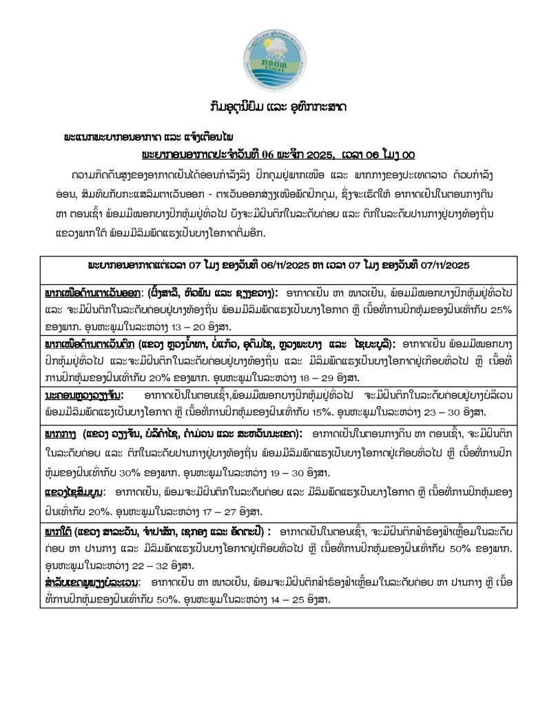 ປະຈຳເຊົ້າວັນທີ 06 ພະຈິກ 2025, ຄວາມກົດດັນສູງຂອງອາກາດເຢັນໄດ້ອ່ອອນກໍາລັງລົງປົກຄຸມຢູ່ພາກເໜືອ ແລະ ພາກກາງຂອງປະເທດລາວ ດ້ວຍກໍາລັງອ່ອນ, ສົມທົບກັບກະແສລົມຕາເວັນອອກ-ຕາເວັນອອກສ່ຽງເໜືອພັດປົກຄຸມ, ເຊິ່ງຈະເຮັດໃຫ້ອາກາດເຢັນໃນຕອນກາງຄືນ ຫາ ຕອນເຊົ້າ ພ້ອມມີໝອກບາງປົກຫຸ້ມຢູ່ທົ່ວໄປ ຍັງຈະມີຝົນຕົກໃນລະດັບຄ່ອຍ ແລະ ຕົກໃນລະດັບປານກາງຢູ່ບາງທ້ອງຖິ່ນແຂວງພາກໃຕ້ ພ້ອມມີລົມພັດແຮງເປັນບາງໂອກາດຕື່ມອີກ.
