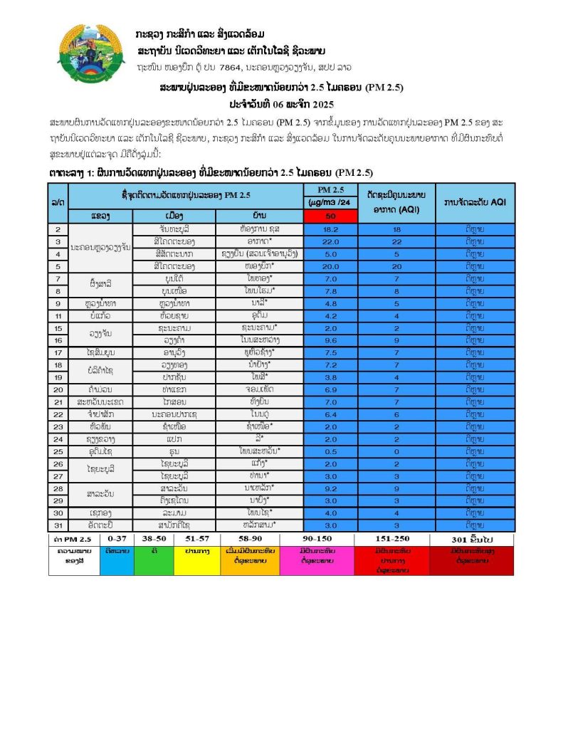 ລາຍງານສະພາບຝຸ່ນລະອອງທີ່ມີຂະໜາດນ້ອຍ ກວ່າ 2.5 ໄມຄຣອນ (PM 2.5) ່ ປະຈຳວັນທີ 06 ພະຈິກ 2025 ແຕ່ລະຈຸດມີດັ່ງລຸ່ມນີ້: