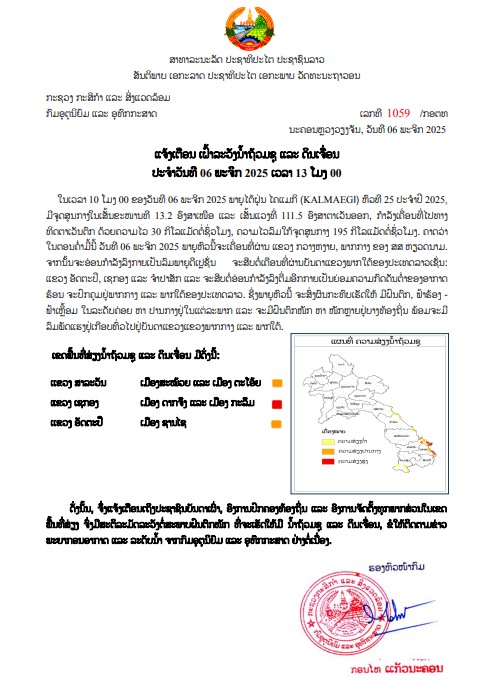 ແຈ້ງເຕືອນ ເຝົ້າລະວງນ້ຳຖ້ວມຊຸ ແລະ ດິນເຈື່ອນ.ພາຍຸໃຕ້ຝຸ່ນ KALMAEGI ຄາດວ່າໃນຕອນຄ່ຳຂອງວັນທີ 6 ພະຈິກ ແຈ້ງການດັ່ງລຸ່ມນີ້: