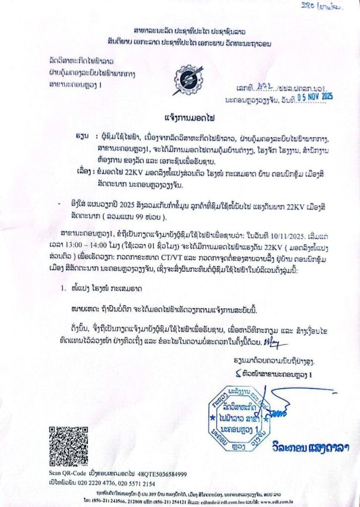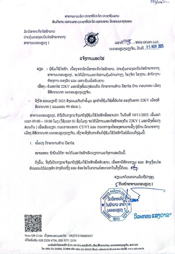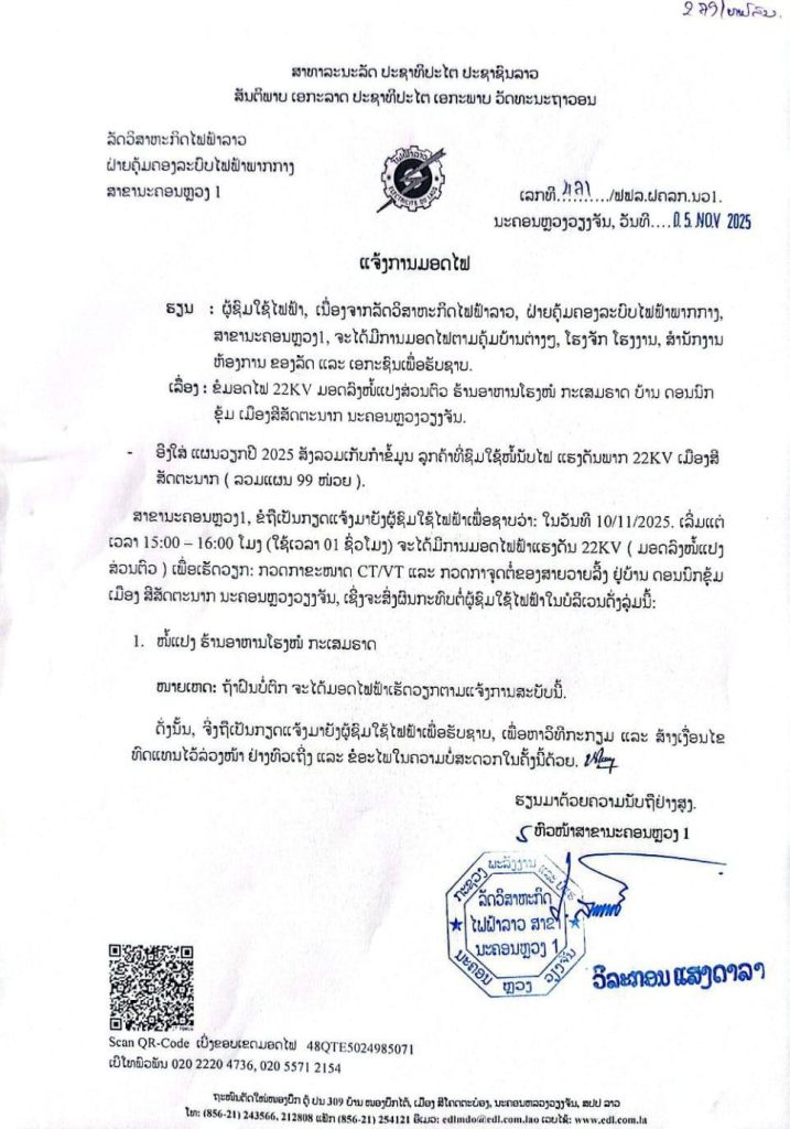 ແຈ້ງມອດໄຟ ວັນທີ 10.11.2025 ຕາມແຈ້ງການສະບັບລຸ່ມນີ້: