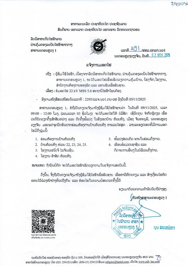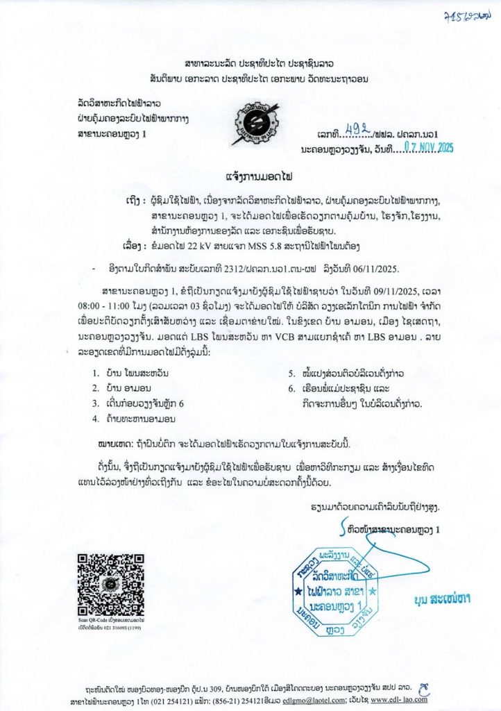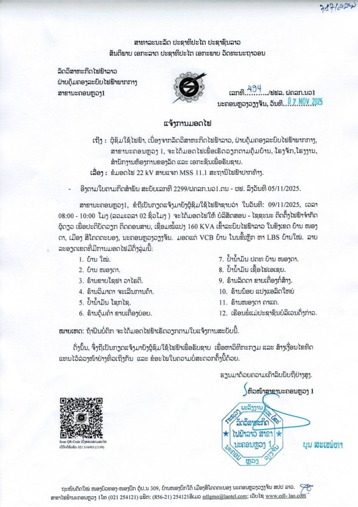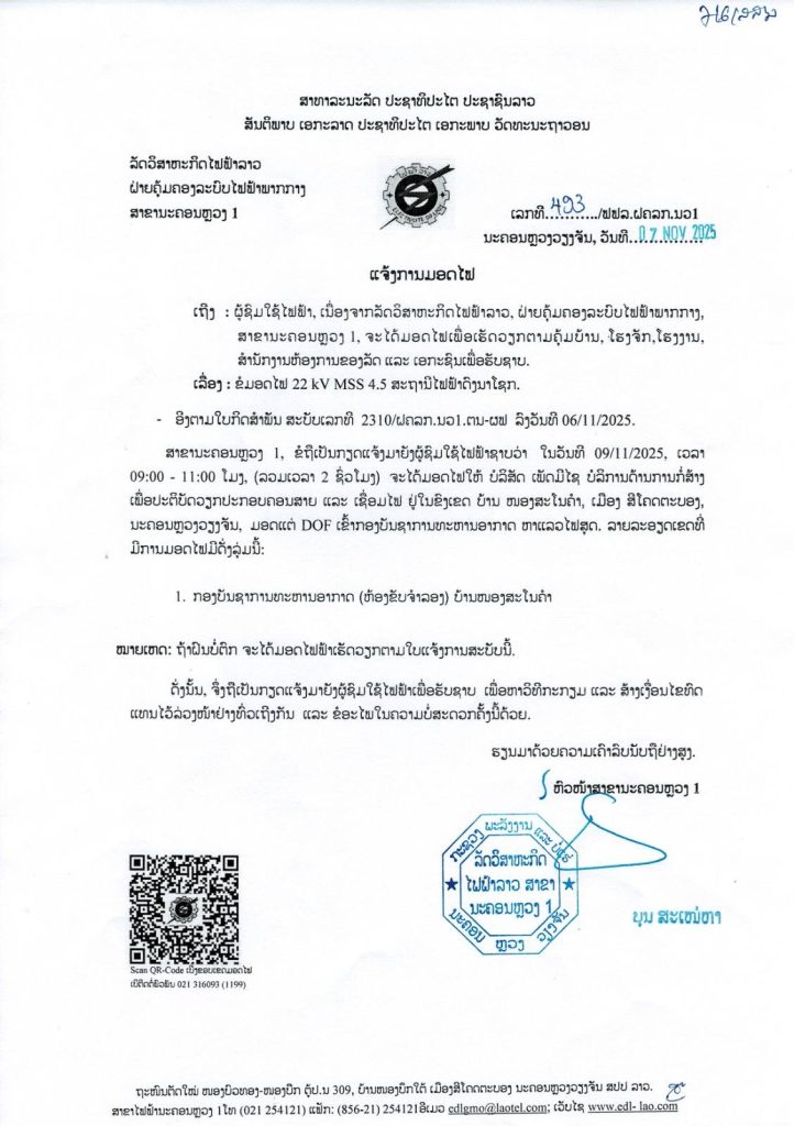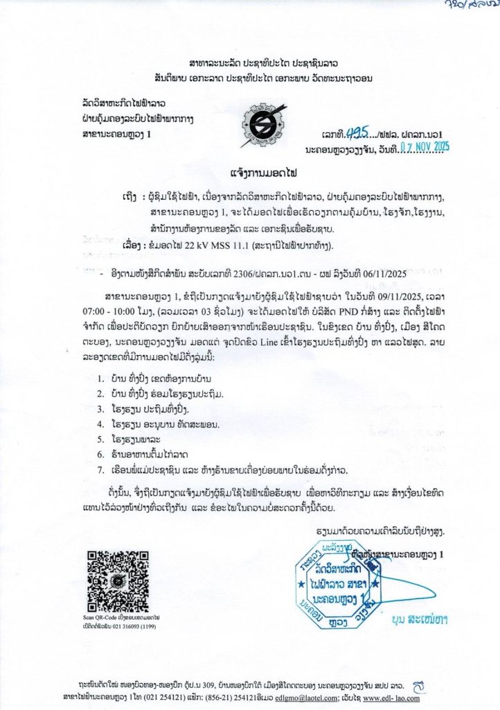 ແຈ້ງການມອດໄຟ ວັນທີ 09/11/2025