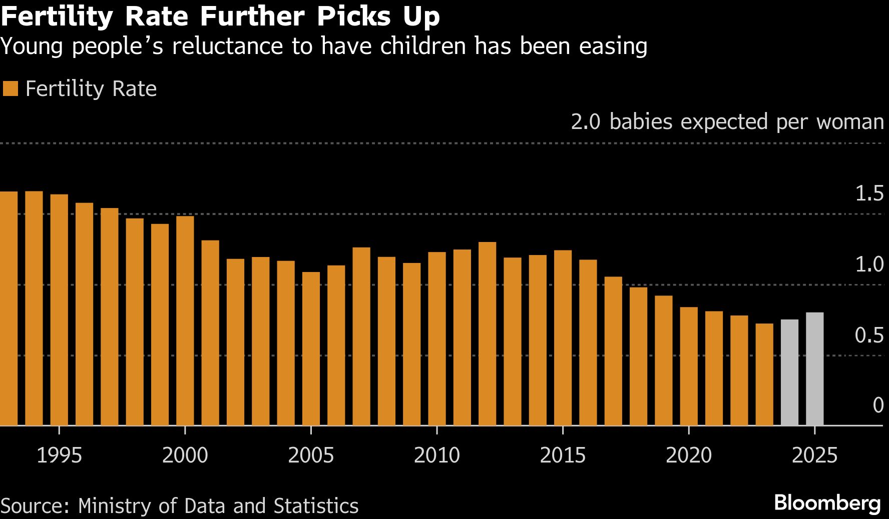 The number of babies a woman is expected to have over her lifetime increased to 0.8 last year from 0.75 in 2024, preliminary data released Wednesday by the Ministry of Data and Statistics showed. Births in 2025 climbed 6.8 percent from the previous year to 254,500, the highest total since 2021, when about 260,600 babies were born.