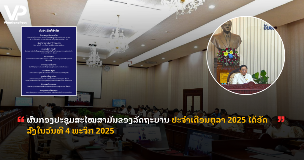 ກອງປະຊຸມສະໄໝສາມັນຂອງລັດຖະບານ ປະຈຳເດືອນຕຸລາ 2025 ໄດ້ອັດລົງໃນວັນທີ 4 ພະຈິກ 2025 ທີ່ສໍານັກງານນາຍົກລັດຖະມົນຕີ ໂດຍການເປັນປະທານ ຂອງທ່ານ ສອນໄຊ ສີພັນດອນ ນາຍຍົກລັດຖະມົນຕີ, ມີບັນດາ ຮອງນາຍຍົກລັດຖະມົນຕີ, ສະມາຊິກລັດຖະບານ, ຜູ້ຕາງໜ້າກະຊວງ-ອົງການ, ການນໍານະຄອນຫວງວຽງຈັນ ແລະ ບັນດາແຂວງເຂົ້າຮ່ວມແບບເຊິ່ງໜ້າ ແລະ ຜ່ານລະບົບກອງປະຊຸມທາງໄກ ເພື່ອຮັບຟັງ ແລະ ປະກອບຄຳເຫັນ ຕໍ່ການສະຫລຸບວຽກງານ ປະຈຳເດືອນຕຸລາ ແລະ ທິດທາງແຜນວຽກຈຸດສຸມ ປະຈຳເດືອນພະຈິກ 2025. ທົ່ວປະເທດສືບຕໍ່ຮັກສາໄດ້ສະຖຽນລະພາບທາງດ້ານການເມືອງຢ່າງໜັກແໜ້ນ, ສັງຄົມມີຄວາມສະຫງົບ ແລະ ເປັນລະບຽບຮຽບຮ້ອຍໂດຍພື້ນຖານ.ສາມາດຈັດເກັບລາຍຮັບເຂົ້າງົບປະມານໄດ້ 59.858 ຕື້ກີບ ເທົ່າກັບ 88% ຂອງແຜນປີ, ການປະຕິບັດແຜນລາຍຈ່າຍໄດ້ 47.631 ຕື້ກີບ ເທົ່າກັບ 67% ຂອງແຜນປີ; ການຄວບຄຸມອັດເງິນເຟີ້ ຫລຸດລົງຈາກ 4,5% ໃນເດືອນກັນຍາ ເປັນ 4% ໃນເດືອນຕຸລາ;ສາມາດເພີ່ມຄັງສໍາຮອງເງິນຕາຕ່າງປະເທດ ກຸ້ມການນໍາເຂົ້າ […]