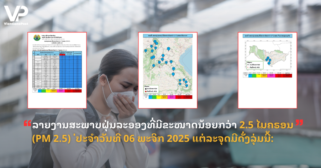 ລາຍງານສະພາບຝຸ່ນລະອອງທີ່ມີຂະໜາດນ້ອຍ ກວ່າ 2.5 ໄມຄຣອນ (PM 2.5) ່ ປະຈຳວັນທີ 06 ພະຈິກ 2025 ແຕ່ລະຈຸດມີດັ່ງລຸ່ມນີ້: