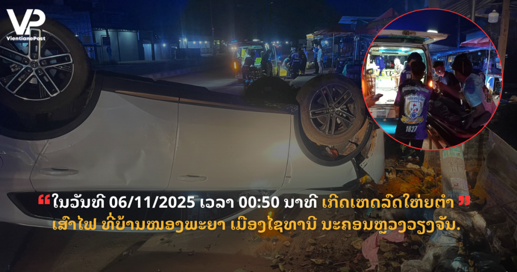ຈາກການລາຍງານຂອງໜ່ວຍກູ້ໄພຊ່ວຍເຫຼືອຜູ້ດ້ອຍໂອກາດ1627 ໃຫ້ຮູ້ວ່າ: ໃນວັນທີ 06/11/2025 ເວລາ 00:50 ນາທີໄດ້ຮັບແຈ້ງເຫດຈາກປະຊາຊົນວ່າ: ມີລົດໃຫ່ຍຕຳເສົາໄຟ ທີ່ບ້ານໜອງພະຍາ ເມືອງໄຊທານີ ນະຄອນຫຼວງວຽງຈັນ. ເມື່ອໜ່ວຍກູ້ໄພໄປຮອດພົບເຫັນຜູ້ບາດເຈັບ 1 ຄົນ ເປັນເພດຊາຍ ຊື່ ທ້າວ ເພັດ, ອາຍຸ 33ປີ, ບ້ານດົງຈອງ, ເມືອງໄຊເສດທາ, ນະຄອນຫຼວງວຽງຈັນ, ອາການເບື້ອງຕົ້ນແໜ້ນໜ້າເອີກ ແລະ ປາກແຕກ. ດັ່ງນັ້ນ, ທາງໜ່ວຍກູ້ໄພ ຈຶ່ງໄດ້ປະຖົມພະຍາບານເບື້ອງຕົ້ນແລ້ວນຳສົ່ງ ໂຮງໝໍມິດຕະພາບ 150 ຕຽງ ຢ່າງປອດໄພ. ໜ່ວຍກູ້ໄພຊ່ວຍເຫຼືອຜູ້ດ້ອຍໂອກາດ1627