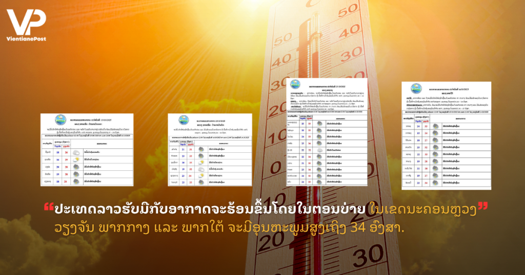 ປະເທດລາວຮັບມືກັບອາກາດຈະຮ້ອນຂຶ້ນໂດຍໃນຕອນບ່າຍ ໃນເຂດນະຄອນຫຼວງວຽງຈັນ ພາກກາງ ແລະ ພາກໃຕ້ ຈະມີອຸນຫະພູມສູງເຖິງ 34 ອົງສາ.