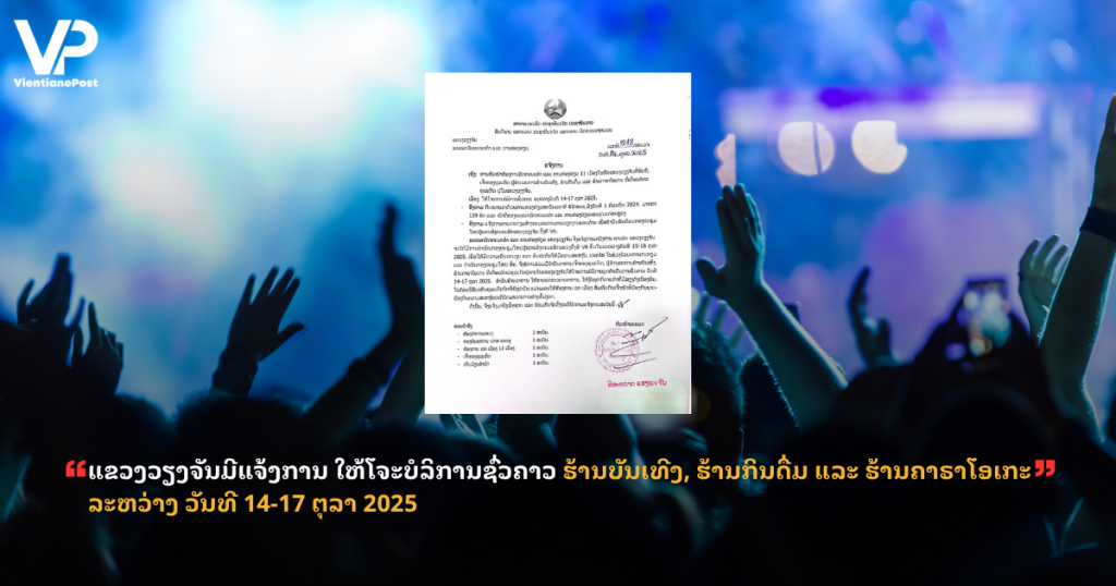 ແຂວງວຽງຈັນມີແຈ້ງການ ໃຫ້ໂຈະບໍລິການຊົ່ວຄາວ ຮ້ານບັນເທີງ, ຮ້ານກິນດື່ມ ແລະ ຮ້ານຄາຣາໂອເກະ ວັນທີ 14-17 ຕຸລາ 2025