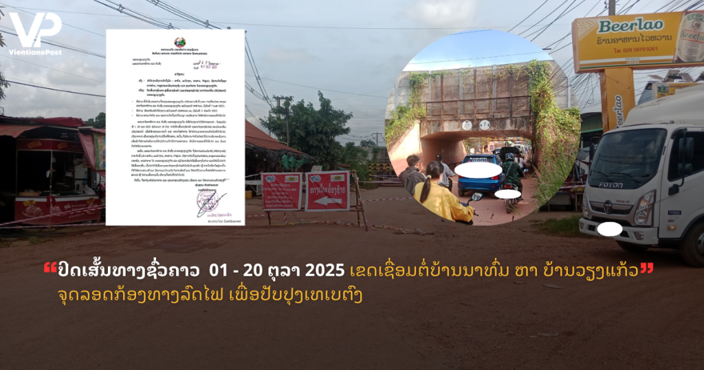 ປິດເສັ້ນທາງຊົ່ວຄາວ 01 – 20 ຕຸລາ 2025 ເຂດເຊື່ອມຕໍ່ບ້ານນາທົ່ມ ຫາ ບ້ານວຽງແກ້ວ ຈຸດລອດກ້ອງທາງລົດໄຟ ເພື່ອປັບປຸງເທເບຕົງ
