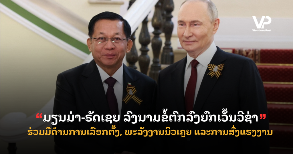 ລັດຖະບານທະຫານມຽນມ່າໄດ້ລົງນາມຂໍ້ຕົກລົງຍົກເວັ້ນວີຊ່າກັບຣັດເຊຍ ພ້ອມແຜນການປຶກສາຫາລືປີ 2025–2030 ຮ່ວມມືດ້ານການເລືອກຕັ້ງ, ພະລັງງານນິວເຄຼຍ ແລະການສົ່ງແຮງງານ ທ່າມກາງຄວາມສຳພັນແນ່ນແຟ້ນຫຼັງການລັດປະຫານ. ວັນທີ 3 ພະຈິກ 2025 ເວັບໄຊ Mizzima ລາຍງານວ່າ ພະເອກອາວຸໂສຕານ ສ່ວຍ ອະດີດຜູ້ນຳລັດຖະບານທະຫານມຽນມ່າ ປະຈຸບັນເປັນລັດຖະມົນຕີການຕ່າງປະເທດ ແລະ ທ່ານເຊີເກ ລາຟຣອຟ ລັດຖະມົນຕີການຕ່າງປະເທດຣັດເຊຍ ໄດ້ລົງນາມຂໍ້ຕົກລົງຍົກເວັ້ນວີຊ່າສຳລັບປະຊາຊົນສອງປະເທດ ໃນການປະຊຸມຄວາມມັ້ນຄົງຢູເຣເຊຍລະດັບສູງ ທີ່ນະຄອນ Minsk ຂອງ Belarus. ແມ່ນວ່າບໍ່ມີການເປີດເຜີຍລາຍລະອຽດຂອງຂໍ້ຕົກລົງຍົກເວັ້ນວີຊ່າ ແຕ່ລັດຖະບານທະຫານໄດ້ລະບຸວ່າ ທັງສອງຝ່າຍຍັງໄດ້ລົງນາມແຜນການປຶກສາຫາລືລະຫວ່າງກະຊວງການຕ່າງປະເທດໃນຊ່ວງປີ 2025–2030. ນອກຈາກນັ້ນ ຍັງມີການຫາລືເຖິງຄວາມເປັນໄປໄດ້ທີ່ຄະນະກຳມະການເລືອກຕັ້ງຂອງຣັດເຊຍ ແລະສະມາຊິກສະພາ Duma ຈະສົ່ງຜູ້ສັງເກດການເລືອກຕັ້ງທີ່ລັດຖະບານທະຫານເມັຽນມາວາງແຜນຈັດໃນເດືອນທັນວານີ້. ນັບຕັ້ງແຕ່ການລັດປະຫານປີ 2021 ມຽນມ່າຮັກສາຄວາມສຳພັນແນ່ນແຟ້ນກັບຣັດເຊຍ ເຊິ່ງເປັນຜູ້ຈັດຫາອາວຸດຢຸດໂທປະກອນ ເຊັ່ນ ໂດຣນ ແລະເຮລິຄອບເຕີ ຕາມຂໍ້ມູນຈາກອົງການພາກປະຊາສັງຄົມ. ທັງສອງປະເທດຍັງມີຂໍ້ຕົກລົງຄຸ້ມຄອງຊຶ່ງກັນແລະກັນໃນຂະບວນການກົດໝາຍສາກົນ ແລະຮ່ວມມືກໍ່ສ້າງໂຮງໄຟຟ້ານິວເຄຼຍຂະໜາດນ້ອຍໃນມຽນມ່າ. ນອກຈາກນັ້ນ ລັດຖະບານທະຫານມຽນມ່າຍັງສົ່ງແຮງງານໄປເຮັດວຽກໃນຣັດເຊຍ ແລະຫາລືເພື່ອສົ່ງເສີມການທ່ອງທ່ຽວລະຫວ່າງກັນ ເຊິ່ງສະທ້ອນເຖິງຄວາມຮ່ວມມືທີ່ເລິກຊຶ້ງຂຶ້ນທ່າມກາງມາດຕະການຄວ່ຳບາດຈາກສາກົນ.
