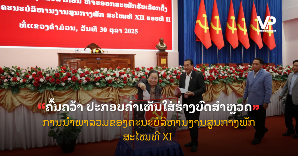 ກອງປະຊຸມ ຄົ້ນຄວ້າ, ປະກອບຄໍາເຫັນໃສ່ຮ່າງບົດສໍາຫຼວດການນໍາພາລວມຂອງຄະນະບໍລິຫານງານສູນກາງພັກ ສະໄໝທີ XI ແລະ ທາບທາມບຸກຄະລາກອນ ທີ່ຈະອອກສະໝັກຮັບເລືອກຕັ້ງເຂົ້າໃນ ຄະນະບໍລິຫານງານສູນກາງພັກ ສະໄໝທີ XII ຮອບທີ II ຢູ່ຈຸດແຂວງຄໍາມ່ວນ ຈັດໃນຂຶ້ນວັນທີ 30 ຕຸລາ 2025 ຢູ່ທີ່ສະໂມສອນຂອງແຂວງ, ໂດຍພາຍໃຕ້ການເປັນປະທານຂອງ ສະຫາຍ ນາງ ສີໃສ ລືເດດມູນສອນກໍາມະການກົມການເມືອງສູນກາງພັກຫົວໜ້າຄະນະຈັດຕັ້ງສູນກາງພັກ, ມີບັນດາສະຫາຍໃນຄະນະບໍລິຫານງານພັກ ແຂວງຄໍາມ່ວນ, ບໍລິຄໍາໄຊ ແລະ ສະຫວັນນະເຂດ ເຂົ້າຮ່ວມ. ໃນໂອກາດນີ້, ສະຫາຍ ວັນໄຊ ພອງສະຫວັນ ກໍາມະການສູນກາງພັກເລຂາຄະນະບໍລິຫານງານພັກແຂວງຄໍາມ່ວນ ຕາງໜ້າຄະນະຮັບຜິດຊອບ ໄດ້ຜ່ານຮ່າງບົດສໍາຫຼວດການນໍາພາລວມ ຂອງຄະນະບໍລິຫານງານສູນກາງພັກ ສະໄໝທີ XI ເພື່ອໃຫ້ບັນດາສະຫາຍທີ່ເຂົ້າຮ່ວມໄດ້ຄົ້ນຄວ້າ, ປະກອບຄໍາເຫັນ ແນໃສ່ເຮັດໃຫ້ຮ່າງບົດສໍາຫຼວດການນໍາພາລວມ ມີເນື້ອໃນຄົບຖ້ວນ, ເລິກເຊິ່ງ, ຖືກກັບຄວາມເປັນຈິງ, ເສີມຂະຫຍາຍດ້ານຕັ້ງໜ້າ, ປັບປຸງແກ້ໄຂຈຸດອ່ອນ-ຂໍ້ຄົງຄ້າງ ໃຫ້ຖືກຈຸດ, ສືບຕໍ່ສ້າງການຫັນປ່ຽນຢ່າງແຂງແຮງ, ເລິກເຊິ່ງ ແລະ ຮອບດ້ານ. […]