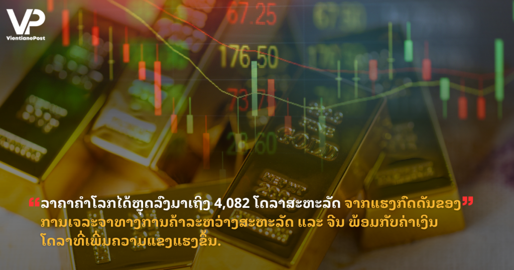 ລາຄາຄຳໂລກໄດ້ຫຼຸດລົງມາເຖິງ 4,082 ໂດລາສະຫະລັດ ຈາກແຮງກົດດັນຂອງການເຈລະຈາທາງການຄ້າລະຫວ່າງສະຫະລັດ ແລະ ຈີນ ພ້ອມກັບຄ່າເງິນໂດລາທີ່ເພີ່ມຄວາມແຂງແຮງຂຶ້ນ.