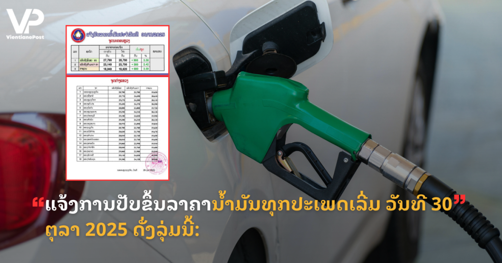 ແຈ້ງການປັບຂຶ້ນລາຄານ້ຳມັນທຸກປະເພດເລີ່ມ ວັນທີ 30 ຕຸລາ 2025 ດັ່ງລຸ່ມນີ້: