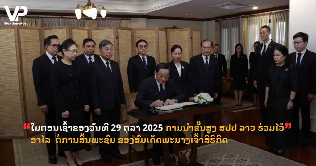 ຂປລ. ໃນຕອນເຊົ້າຂອງວັນທີ 29 ຕຸລາ 2025, ການນໍາຂັ້ນສູງ ນໍາໂດຍ ທ່ານ ສອນໄຊ ສີພັນດອນ ນາຍຍົກລັດຖະມົນຕີ ແຫ່ງ ສປປ ລາວ ໄດ້ເຂົ້າຮ່ວມພິທີເຊັນປຶ້ມໄວ້ອາໄລ ເພື່ອສະແດງຄວາມເສົ້າສະຫລົດໃຈ ຕໍ່ການສິ້ນພະຊົນ ຂອງສົມເດັດພະນາງເຈົ້າສິຣິກິດ ພະບໍລົມຣາຊິນີນາດ ພະບໍຣົມຣາຊະຊົນນະນີພັນປີຫລວງ (ແມ່ຂອງ ພະບາດສົມເດັດ ເຈົ້າຊີວິດ ຣາຊະການທີ 10) ທີ່ສະຖານເອກອັກຄະຣາຊະທູດ ແຫ່ງ ຣາຊະອານາຈັກໄທ ປະຈຳ ສປປ ລາວ. ໃນໂອກາດດັ່ງກ່າວ, ທ່ານ ສອນໄຊ ສີພັນດອນ ໄດ້ຮ່ວມວາງພວງມາລາ ແລະ ເຊັນປຶ້ມໄວ້ອາໄລ ເພື່ອສະແດງຄວາມໄວ້ອາໄລຢ່າງສຸດຊຶ້ງ ຕໍ່ການສູນເສຍບຸກຄົນທີ່ເຄົາລົບຮັກ ຂອງປວງຊົນຊາວໄທ, ເຊິ່ງມີເນື້ອໃນດັ່ງລຸ່ມນີ້: “ໃນນາມ ລັດຖະບານ ແລະ ປະຊາຊົນ ແຫ່ງ ສາທາລະນະລັດ ປະຊາທິປະໄຕ ປະຊາຊົນລາວ, ຂ້າພະເຈົ້າ ຂໍສະແດງຄວາມເສົ້າສະຫລົດໃຈຢ່າງສຸດຊຶ້ງ ຕໍ່ການສິ້ນພະຊົນຂອງ ສົມເດັດພະນາງເຈົ້າສິຣິກິດ […]