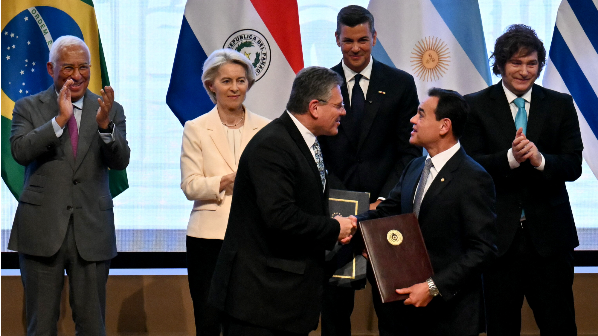 The signing ceremony was attended by senior EU and Mercosur officials, including European Commission President Ursula von der Leyen and European Council President Antonio Costa, together with the foreign ministers of Argentina, Brazil, Paraguay and Uruguay.