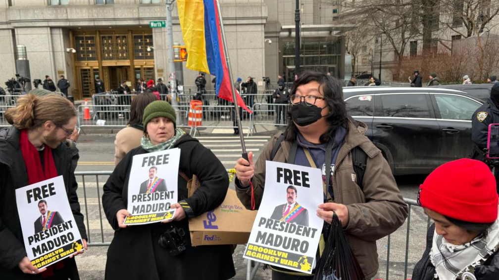 Protesters gathering outside the court were shouting slogans and holding banners of “Free Maduro,” “No War on Venezuela,” and “USA hands off Venezuela.”